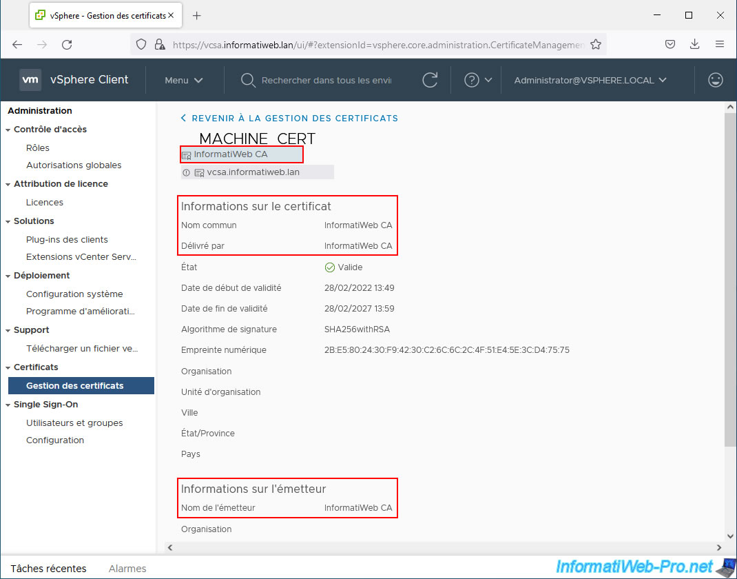 Comme vous pouvez le voir, le certificat "__MACHINE_CERT" est valable pour le nom de domaine de votre serveur (nom commun : vcsa.informatiweb.lan) et a été émis par votre propre autorité de certification (délivré par : InformatiWeb CA).
