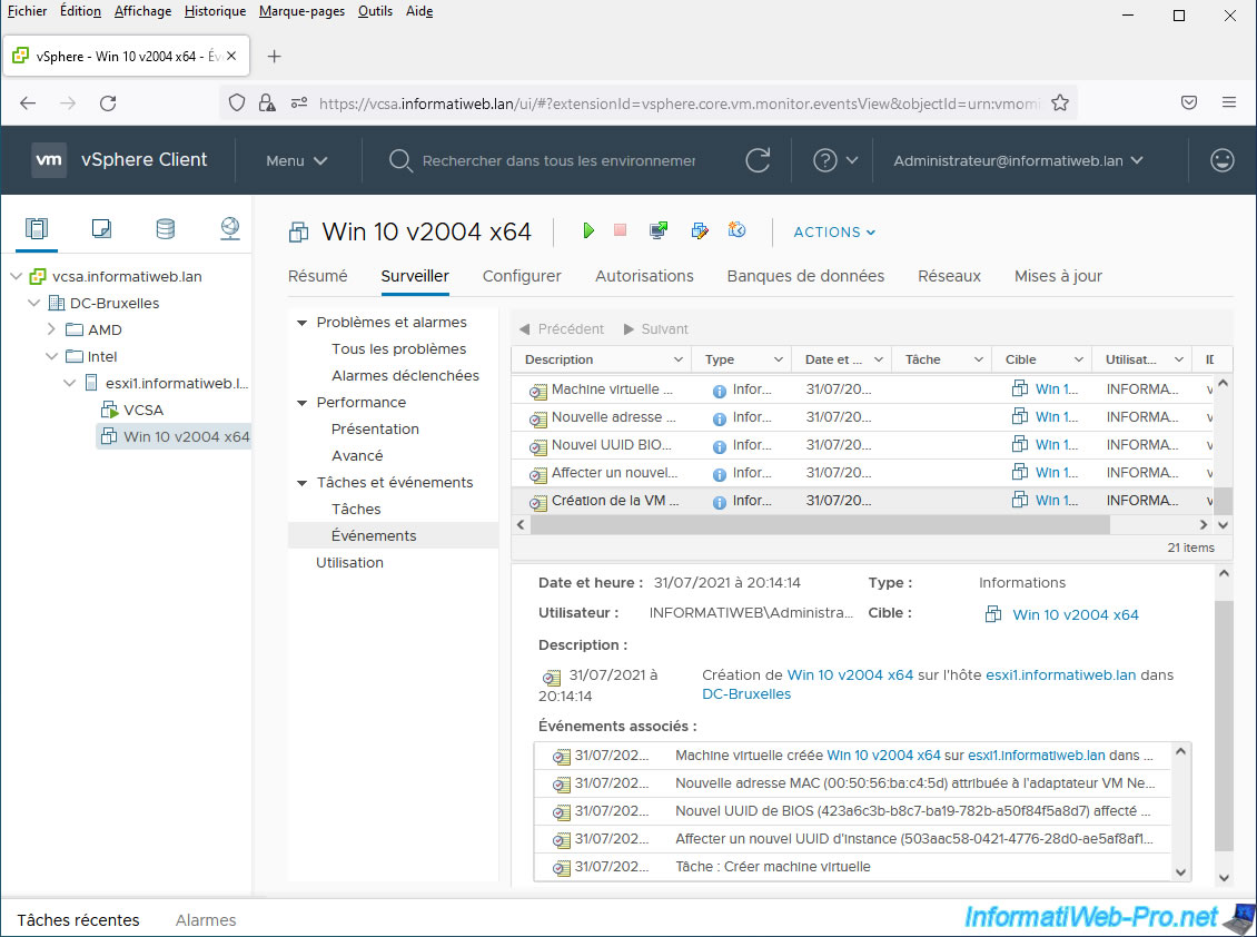 Sur votre serveur VMware vCenter Server, vous pourrez surveiller les différentes actions, avertissements, erreurs, ... qui se sont produits grâce aux sections "Tâches" et "Evénements".