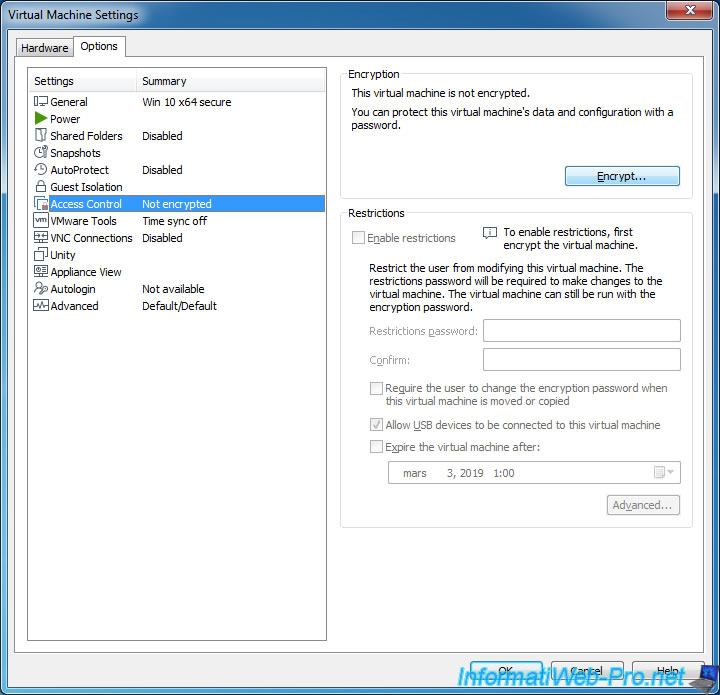 Pour protéger votre machine virtuelle contre les accès non autorisés (sur le PC hôte), vous pouvez chiffrer celle-ci via l'option "Options -> Access Control -> Encryption" présente dans les paramètres de votre machine virtuelle.