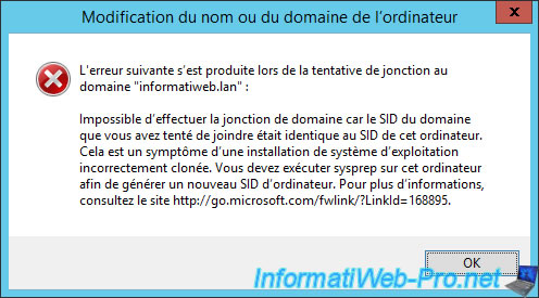 L'erreur suivante s'est produite lors de la tentative de jonction au domaine "informatiweb.lan" : Impossible d'effectuer la jonction de domaine car le SID du domaine que vous avez tenté de joindre était identique au SID de cet ordinateur. Cela est un symptôme d'une installation de système d'exploitation incorrectement clonée. Vous devez exécuter sysprep sur cet ordinateur afin de générer un nouveau SID d'ordinateur. Pour plus d'informations, consultez le site https://go.microsoft.com/fwlink/?LinkId=168895.