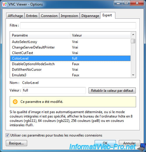 Note : si vous ne configurez pas ces 2 paramètres, vous risquez d'obtenir un message d'erreur : RFB protocol error ...